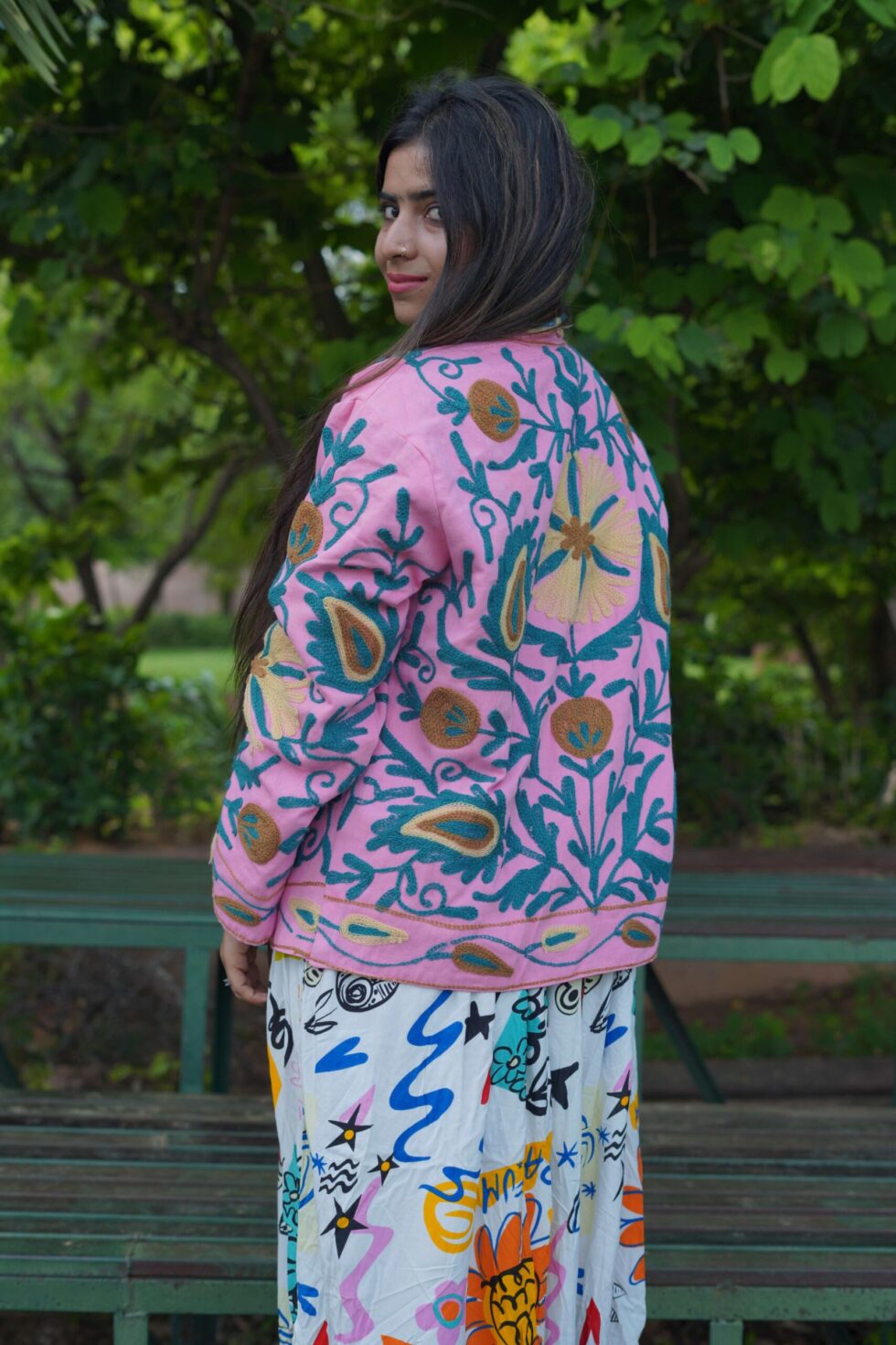Womens Pink Velvet Embroidered Jacket with Floral Design
